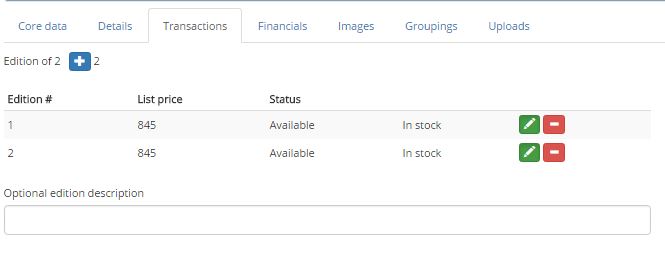 At this stage you must click the Save button to be able to edit the individual items. Once you have done that you can click on the green Edit button to access the details for the item (the red Minus button will delete the item from the Edition).